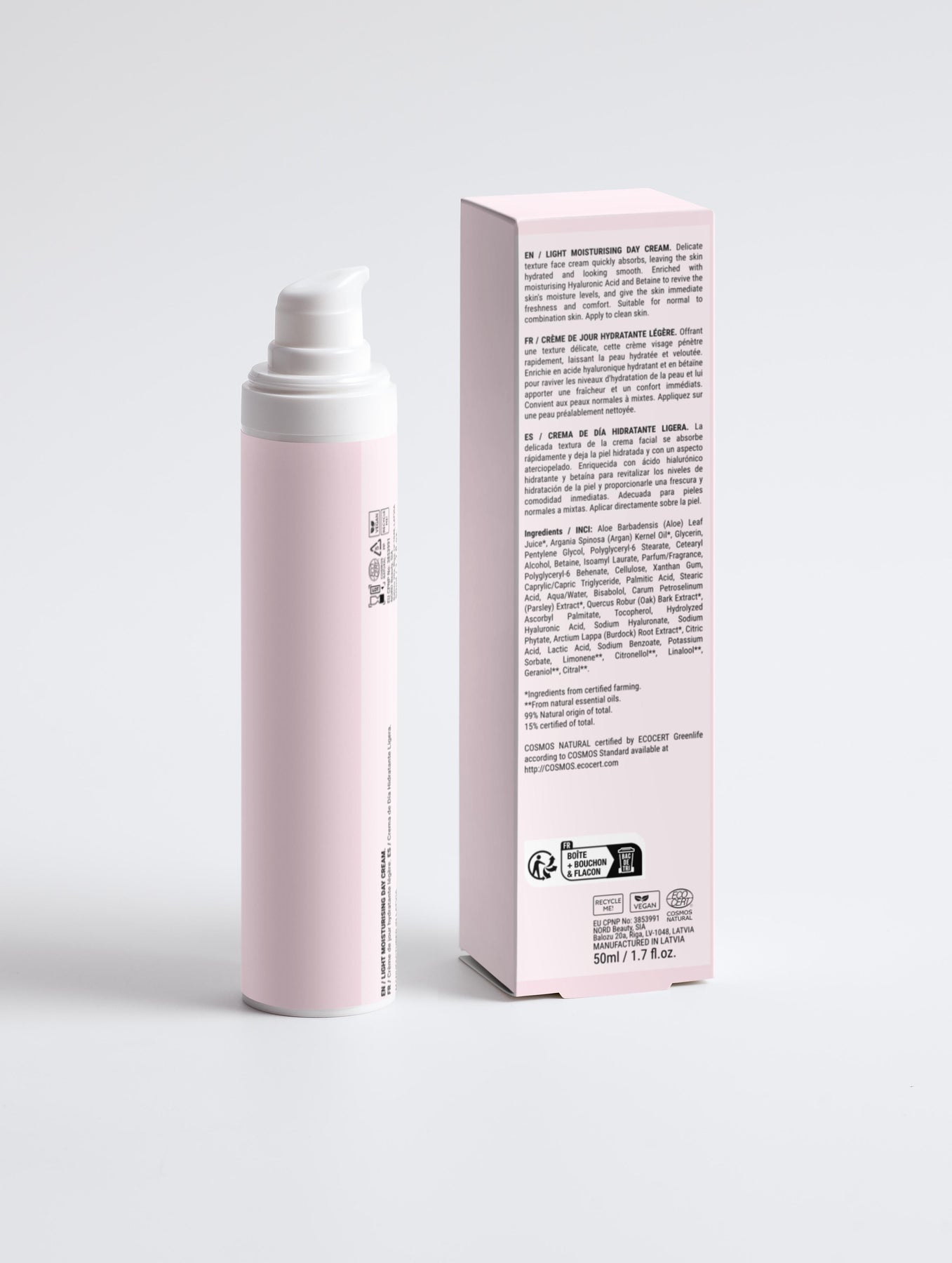 Argan Oil (Active ingredients), Hyaluronic Acid (Active ingredients), Aloe Juice (Active ingredients), Betaine (Active ingredients). INC: Aloe juice, Argan oil, Betaine, Bisabolol, Plant extract, Hyaluronic acid Aloe Barbadensis (Aloe) Leaf Juice➀, Argania Spinosa (Argan) Kernel Oil➀, Glycerin, Pentylene Glycol, Polyglyceryl-6 Stearate, Cetearyl Alcohol, Betaine, Isoamyl Laurate, Parfum, Polyglyceryl-6 Behenate, Cellulose, Xanthan Gum, Caprylic/Capric Triglyceride, Palmitic Acid, Stearic Acid, Aqua, Bisabolol, Carum Petroselinum (Parsley) Extract➀, Quercus Robur (Oak) Bark Extract➀, Ascorbyl Palmitate, Tocopherol, Hydrolyzed Hyaluronic Acid, Sodium Hyaluronate, Sodium Phytate, Arctium Lappa (Burdock) Root Extract➀, Citric Acid, Lactic Acid, Sodium Benzoate, Potassium Sorbate, Limonene➁, Citronellol➁, Linalool➁, Geraniol➁, Citral➁ ➀ Ingredients from organic farming ➁ From natural essential oils